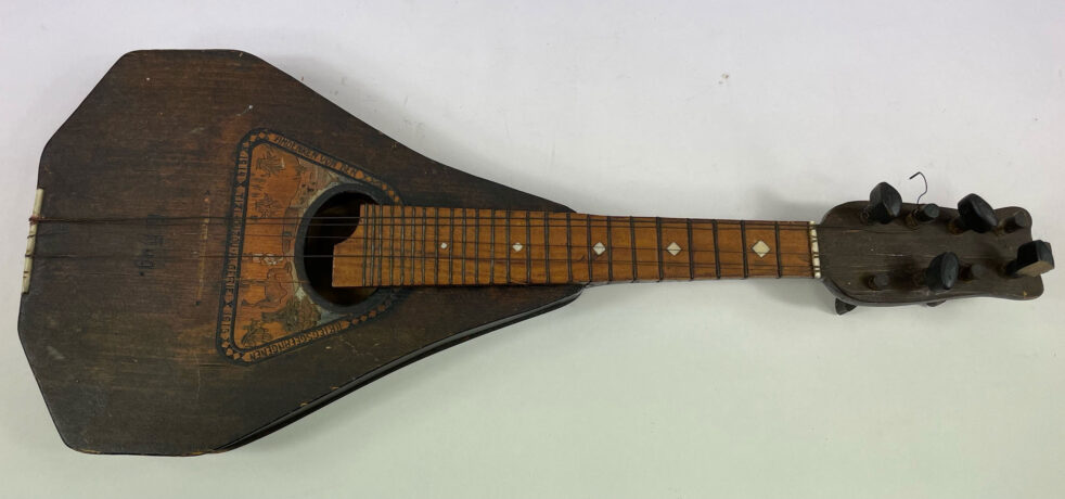 A vintage mandolin with a triangular body and ornate inlay designs.