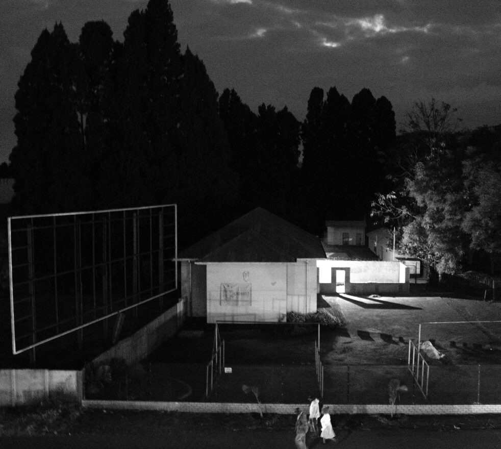 SithaboMathe_ViewfromThando'swindow_2400x2151.jpg Image Breakdown Long Description: The black-and-white image depicts an outdoor scene at night. In the foreground, there are two people walking along a paved area, illuminated partially by streetlights. To the left, a large, empty billboard frame stands against a backdrop of tall, dark trees. Central to the image is a simple, rectangular building with a slanted roof. Its walls are white and reflect soft light, with a small amount of text visible. Additional structures are seen to the right, partially obscured by shadows and trees. The sky is cloudy, with faint light peeking through. Alt-text: Nighttime scene with a building, billboard frame, and two people walking.